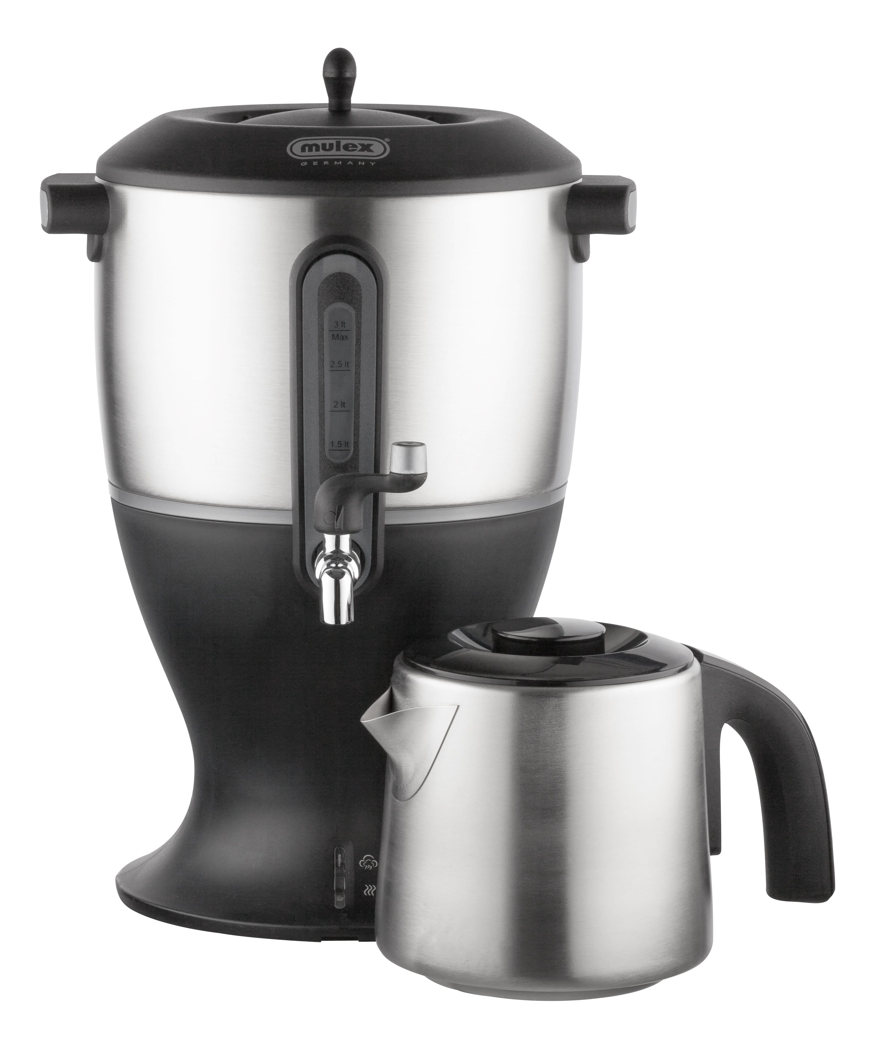 Ein klassischer Samowar von Mulex für die Teezubereitung Zu Hause oder auch im Büro. Mit seinen großem Edelstahl Wasserbehälter, kombiniert mit einem schwarzem hochwertigem Kunststoffgehäuse und einer abnehmbaren hochwertigen Edelstahlkanne. Der Geschmack des Tees entfaltet sich bei 95° C ideal. Das Besondere: mit dem Energiesparmodus steht jederzeit kochendes, heißes oder warmes Wasser bereit. Der Wasserbehälter hat einen aufwändigen Ablasshahn, eine Wasserstandsanzeige und der Lieferumfang beinhaltet eine Wasserauffangvorrichtung. Durch seine einfache Bedienung und leichte Reinigung ist er das Richtige Modell für Ihr Zu Hause.