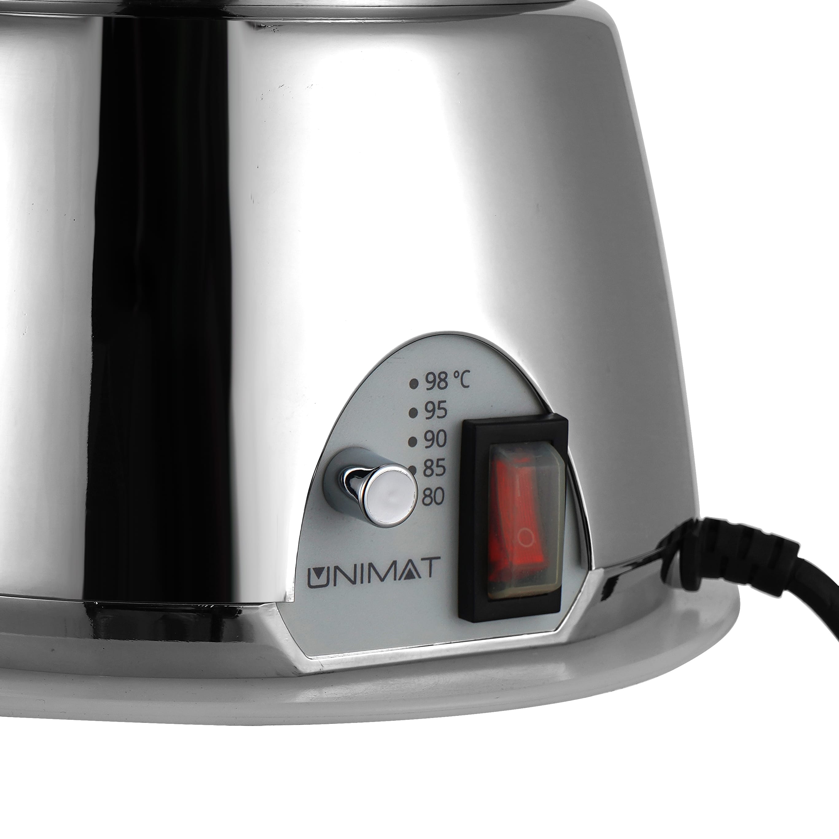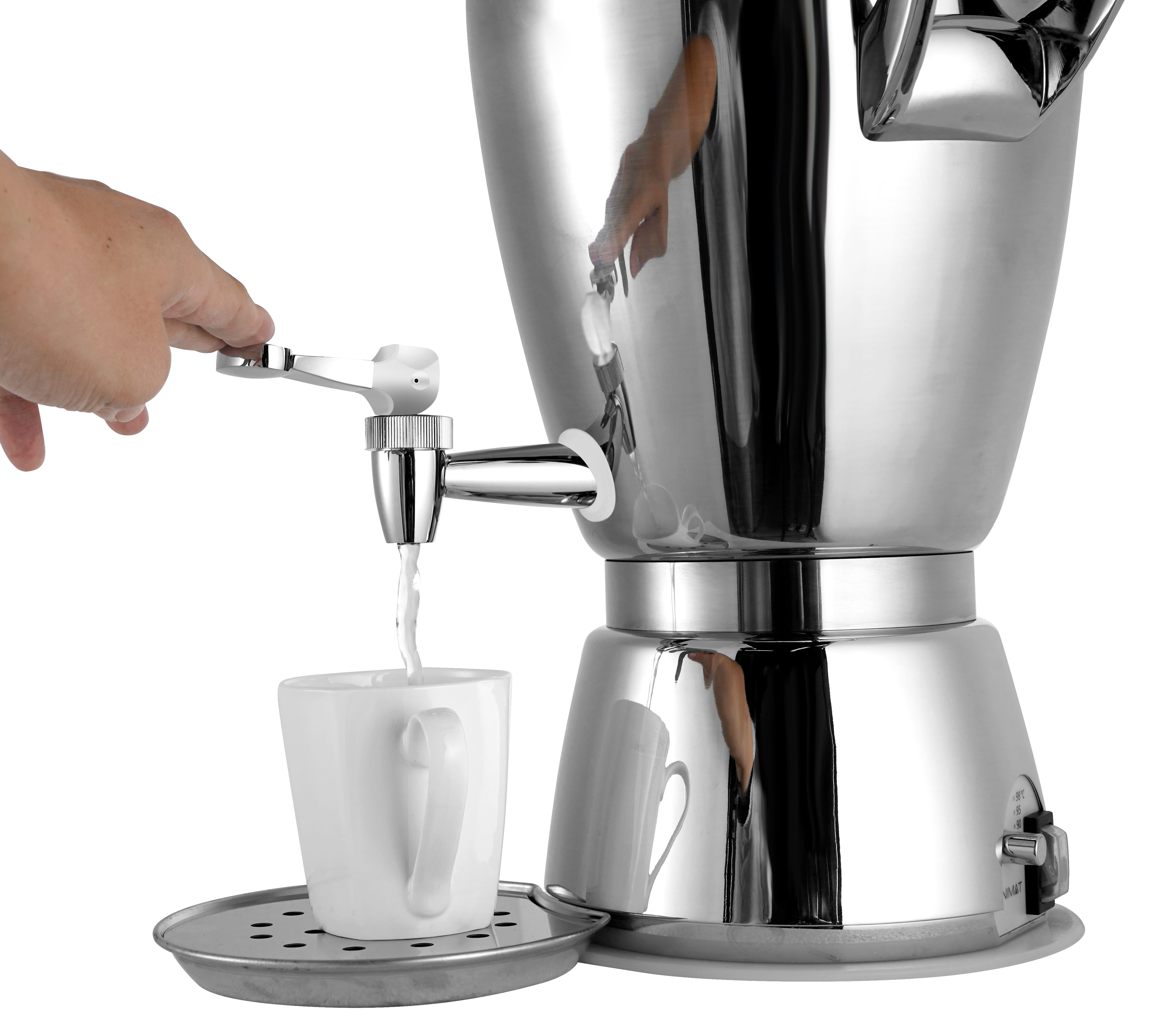Der Samowar der Firma Unimat besteht aus hochwertigem Edelstahl und hat ein ausreichendes Fassungsvermögen. Die starke Heizungleistung gewährleistet eine kurze Aufheizzeit. Das Erhitzen und Warmhalten des Wasser wird elektronisch gesteuert, in einem Bereich zwischen 80°C und 98°C. Ist die eingestellten Temperatur erreicht, schaltet die Heizung automatisch ab und hält die eingestellte Temperatur. Mit der Memory Funktion wird beim Einschalten des Geräts immer die vorher eingestellte Funktion aufgerufen. Die Liter Edelstahlteekanne ist mit einem Teesieb ausgestattet. Als Zubehör wird die Abtropfschale mitgeliefert.