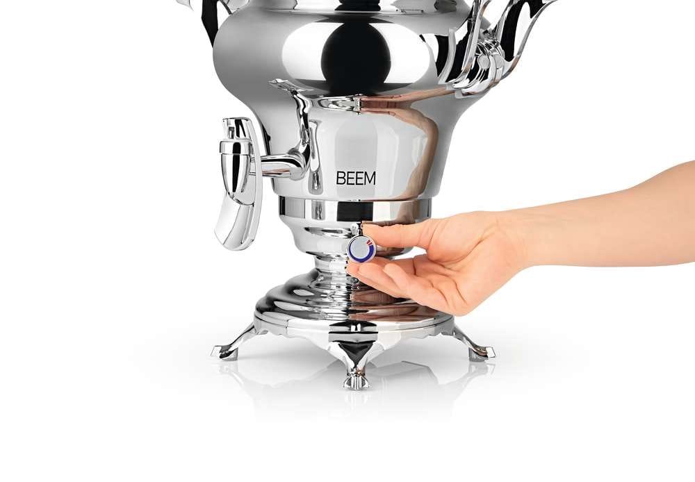 Dieser Samowar zieht alle Blicke auf sich. Das elegante Design geht Hand in Hand mit Funktionalität, die Sie und Ihre Gäste begeistern wird. Bei einen Fassungsvermögen darf es auch gern eine größere Anzahl Gruppe sein. Zwei unterschiedlich leistungsstarke Heizspiralen mit einer ausreichenden Gesamtleistung sorgen für extrem schnelles Erhitzen. Die zweite Heizspriale hält die für die Aromaentfaltung optimale Teetemperatur von 98 °C bei höchst möglicher Energieeffizienz. Das stufenlos einstellbare Thermostat sorgt dafür, dass das Wasser immer die richtige Temperatur beibehält. Gönnen Sie sich und Ihren Gästen das besondere Erlebnis der modernen Teezubereitung, sogar mit berührungsloser Bedienung durch Dispenser.