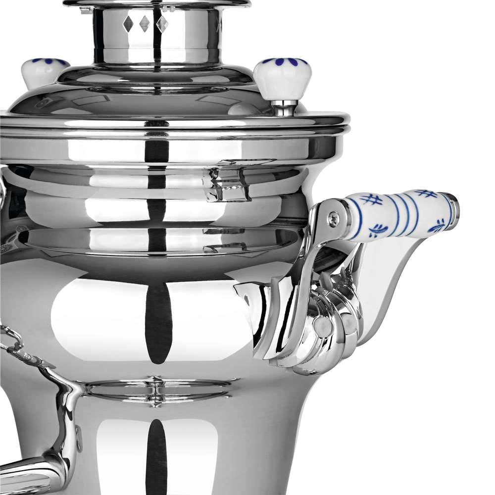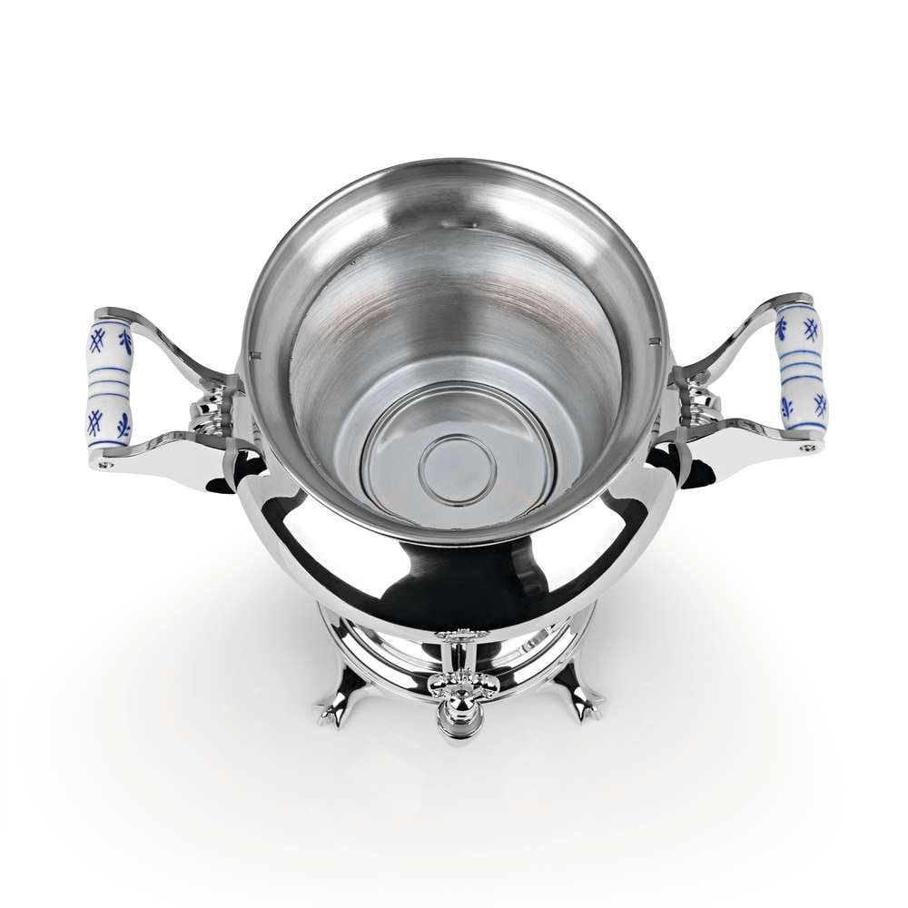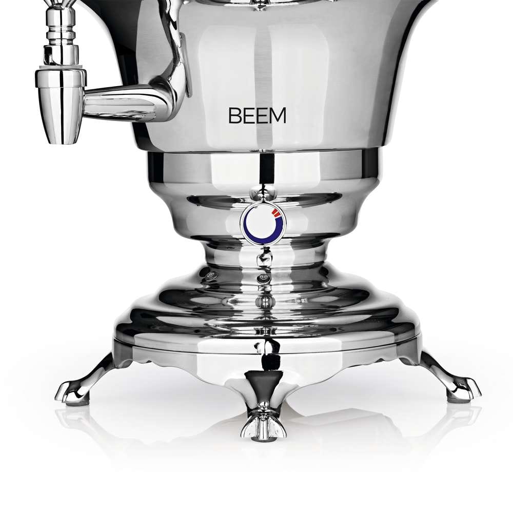 Dieser Samowar zieht alle Blicke auf sich. Das elegante Design geht Hand in Hand mit Funktionalität, die Sie und Ihre Gäste begeistern wird. Bei einen Fassungsvermögen darf es auch gern eine größere Anzahl Gruppe sein. Zwei unterschiedlich leistungsstarke Heizspiralen mit einer ausreichenden Gesamtleistung sorgen für extrem schnelles Erhitzen. Die zweite Heizspriale hält die für die Aromaentfaltung optimale Teetemperatur von 98 °C bei höchst möglicher Energieeffizienz. Das stufenlos einstellbare Thermostat sorgt dafür, dass das Wasser immer die richtige Temperatur beibehält. Gönnen Sie sich und Ihren Gästen das besondere Erlebnis dermodernen Teezubereitung.